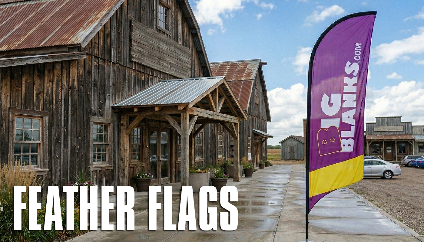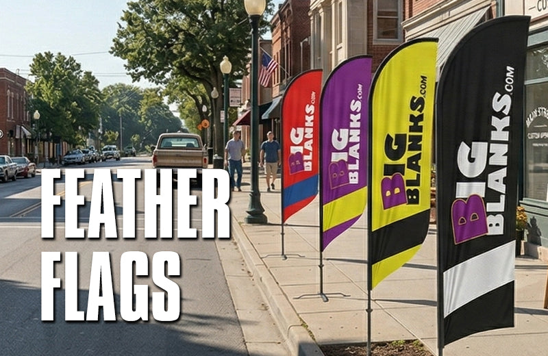 Outfit your business with your own BigBlanks Feather Flags. Available from 5.5ft Tall all the way to nearly 15ft Tall, in 5 different styles. Order Today!